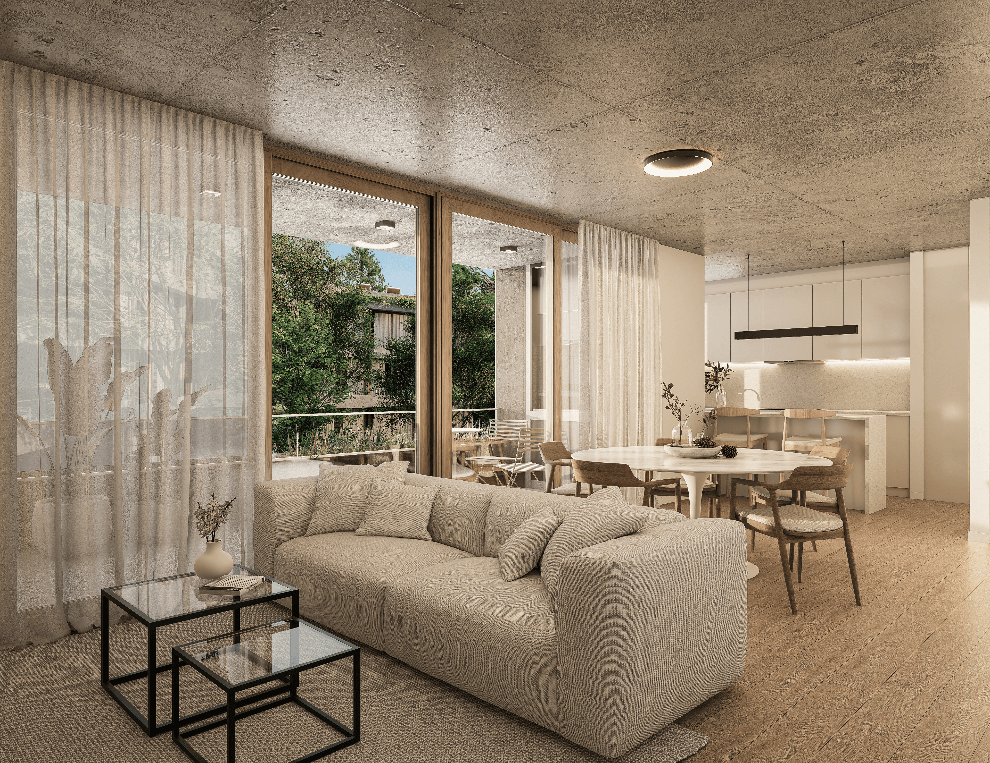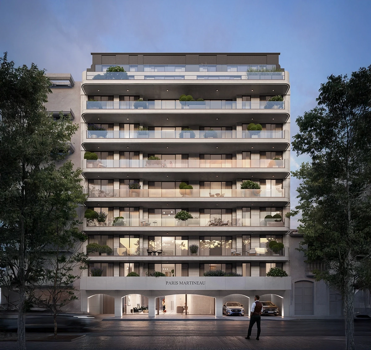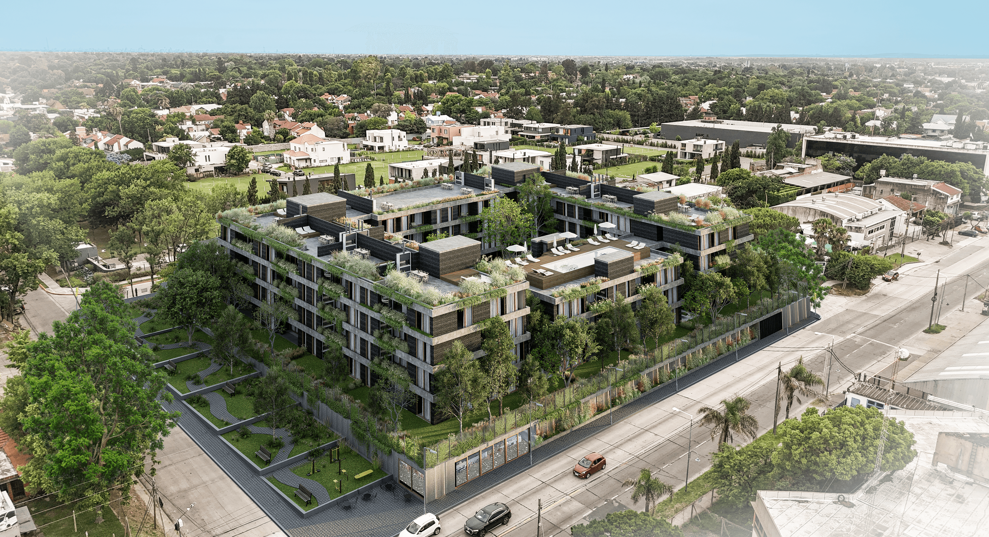 El proyecto se desarrolla en una manzana completa, organizado en cuatro volúmenes que favorecen la ventilación y las visuales hacia un gran jardín central de 700m2. Todas las viviendas están diseñadas para maximizar la luminosidad y la ventilación natural. El proyecto equilibra la vitalidad urbana y la serenidad natural, integrando cesiones al espacio público como una plaza y un fuelle verde sobre la Av. Uruguay para un hábitat sustentable.